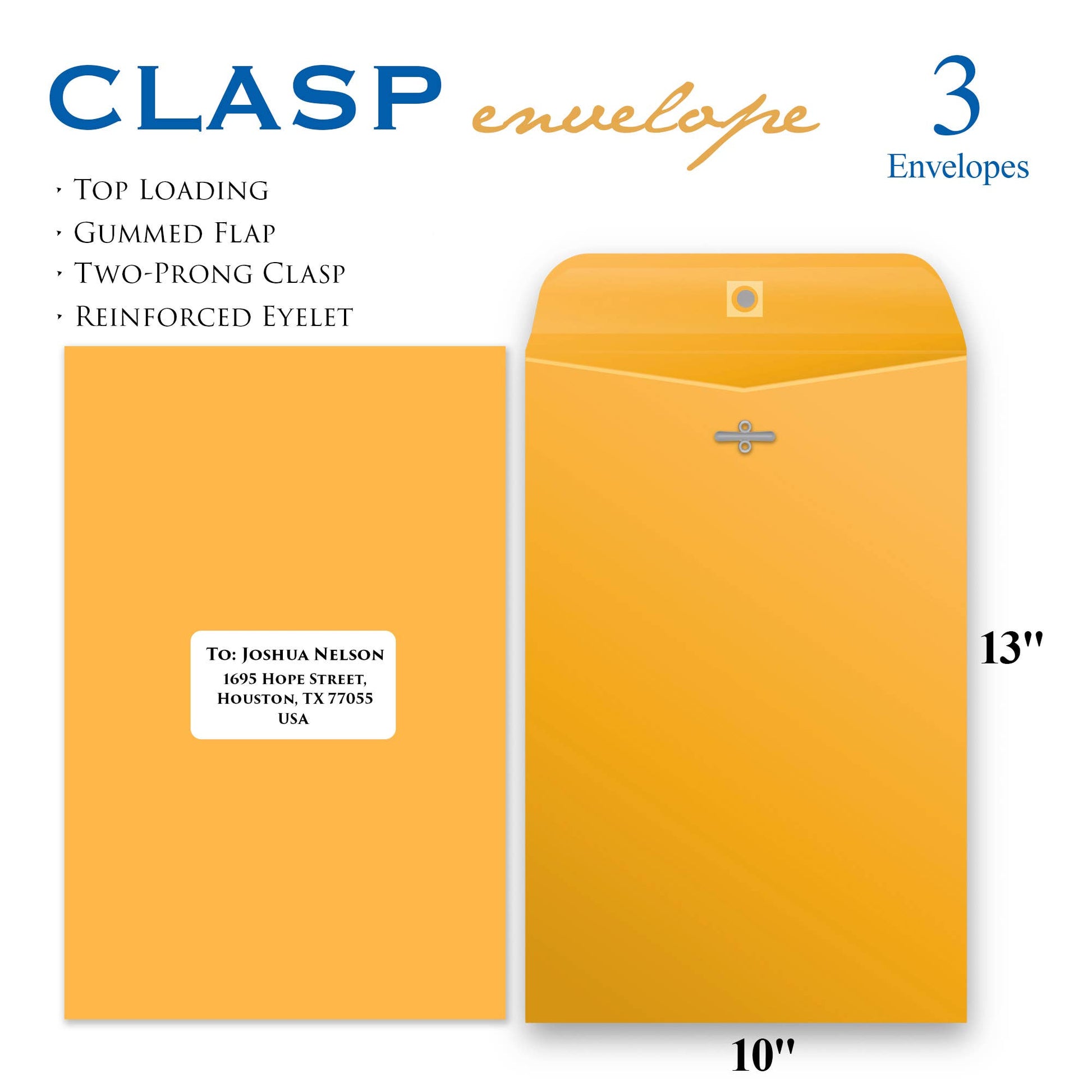 CLASP ENVELOPES. These 10" x 13" envelopes feature a metal clasp made from a strong, durable material that can handle repeated use. Envelopes are great for storing or shipping Letter Sized documents.