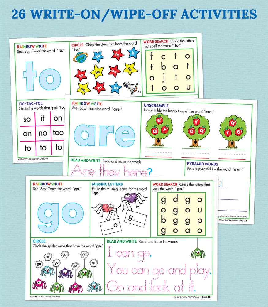 Key Education's Write On/Wipe Off Read and Write First Words activity set features 26 reusable dry erase practice boards that will help your students build sight word knowledge, practice fine motor skills, improve their writing, and build phonemic awareness. Each colorfully illustrated activity card features one or two basic sight words and fun writing and reading activities, including tracing, coloring, word searches, fill-in-the-blanks, and more. Cards can be easily erased after each use to allow your child to practice each sight word as many times as they need to build confidence and master basic these basic literacy skills. This erasable board set includes over 26 sight words and can be wiped clean after each use, making it a great hands-on resource for teachers working with multiple students or parents homeschooling their kids. This set also includes a box of 8 multicolor crayons.