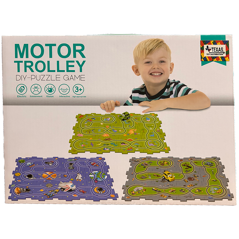 This DIY puzzle game includes 12 pieces that interlock together to create a track! Comes in a retail box with carry handle.