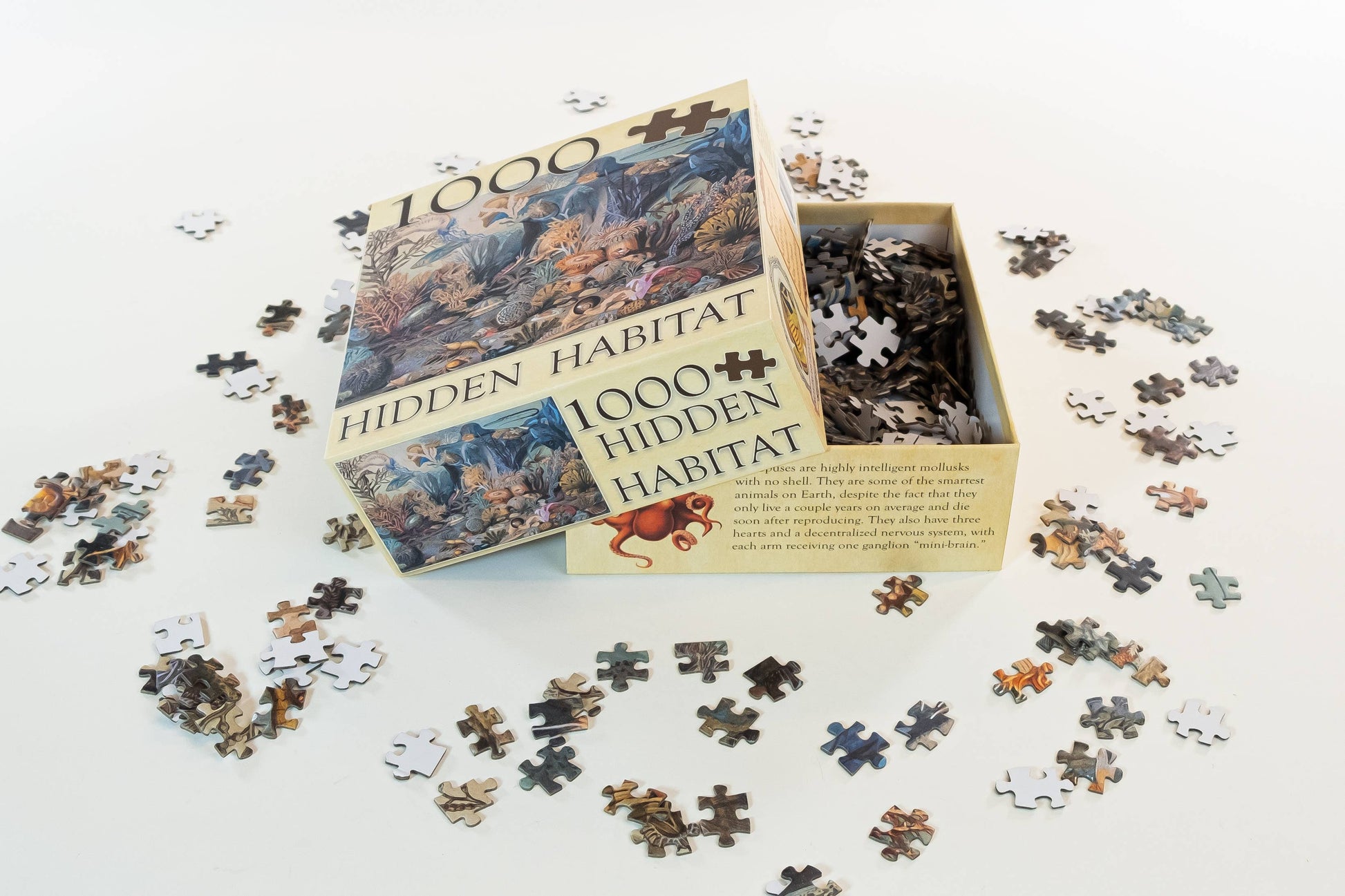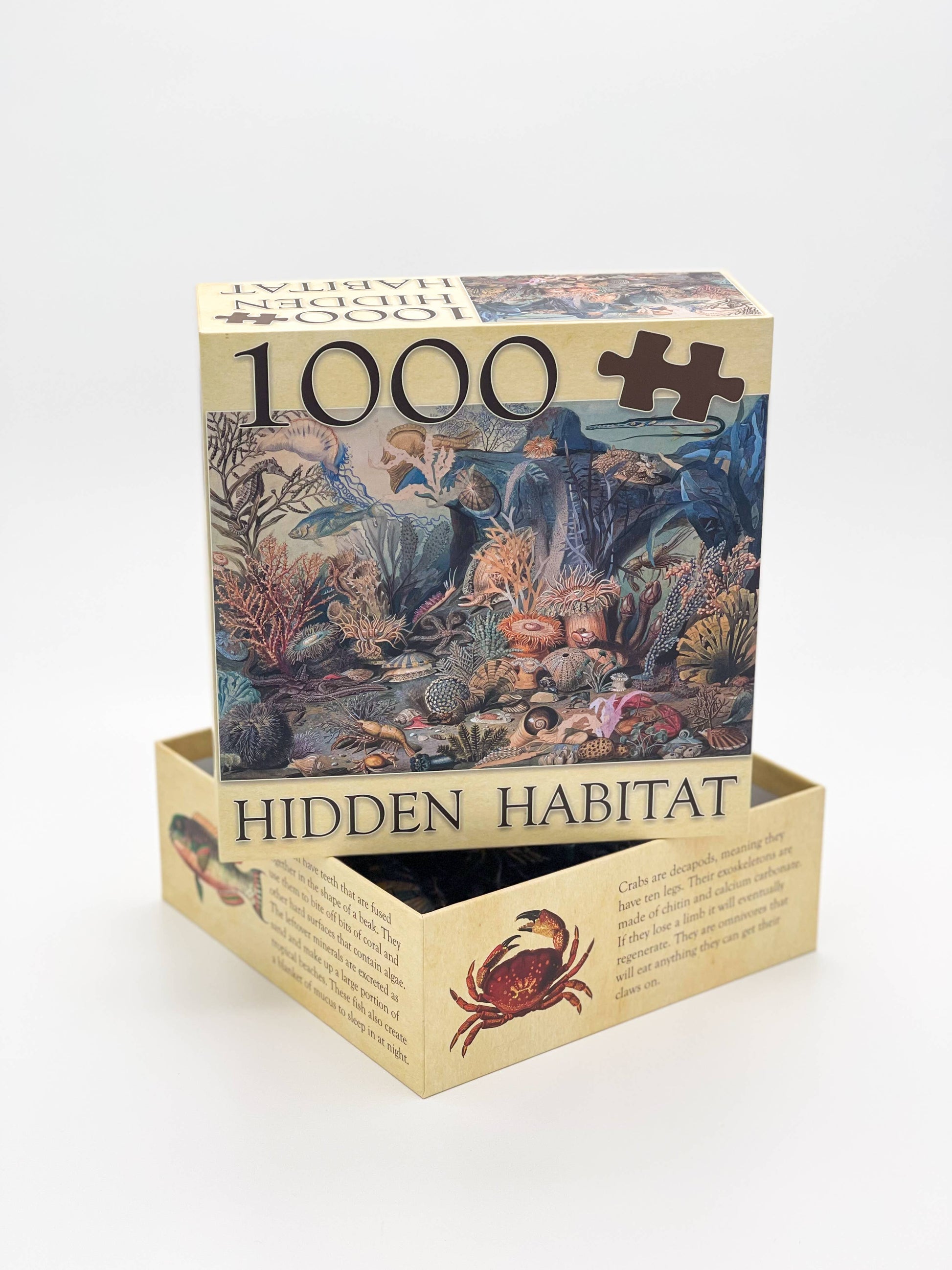 Our 1000 piece “Hidden Habitat” puzzle features the same vintage art used in our “Ecologies: Hidden Habitats” card game. It showcases a detailed intertidal scene full of diverse marine organisms.