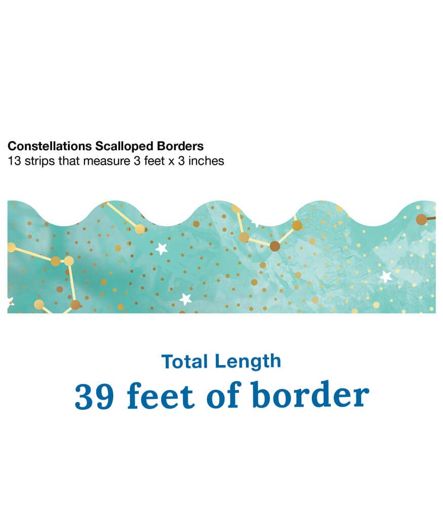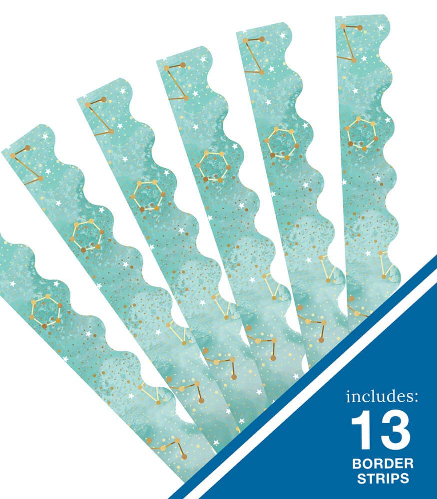 Give your bulletin board displays the perfect finishing touch with scalloped borders. Galaxy Constellations Scalloped Border feature a vibrant skyscape accented with gold foil stars and constellations. The pack includes 13 border strips, each measuring 3' x 2 1/4" for a total length of 39'. --With Carson-Dellosa’s easy-to-customize classroom borders, creating unique displays is fun and easy. Cut and layer borders to add dimension or use individually for a classic style. Be sure to check out other Galaxy products to complement your classroom theme.