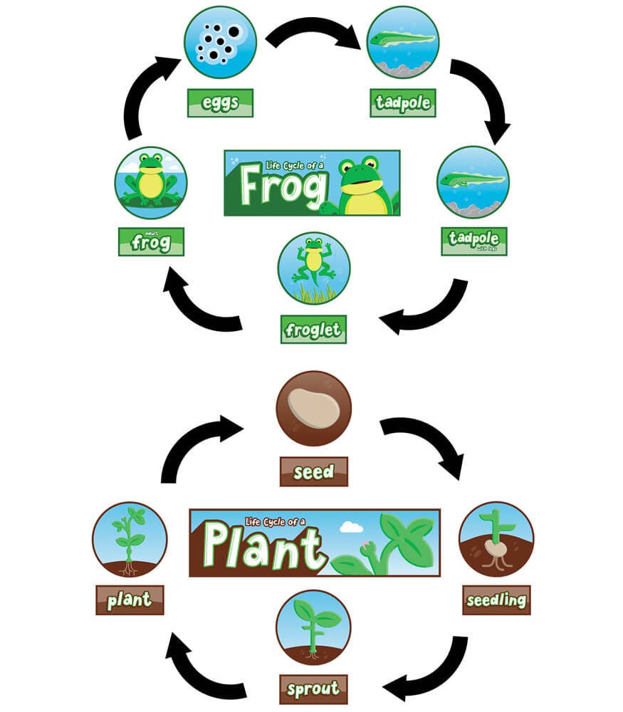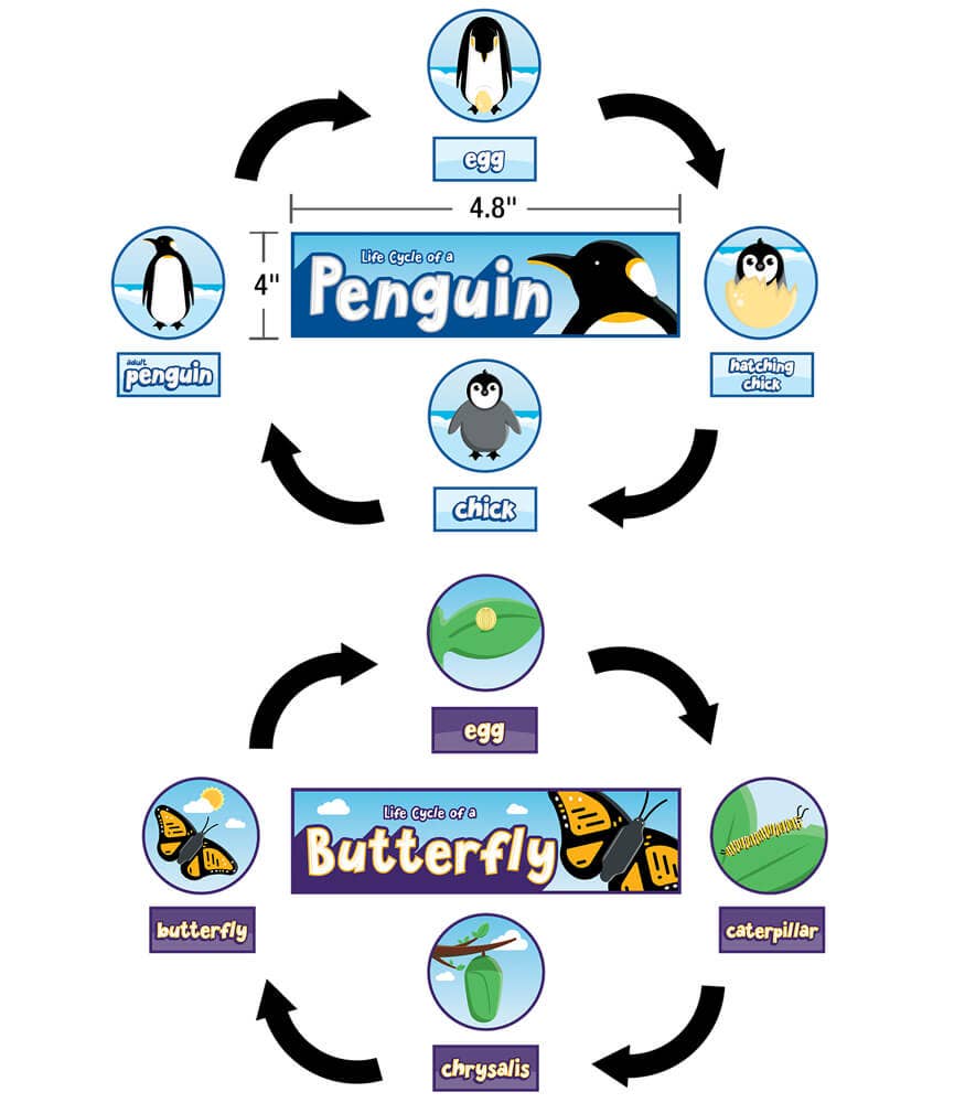 Bring the awe and wonder of life cycles into the classroom with the 55-piece Life Cycles Bulletin Board Set. Great for year-round display, this set can be used interactively to teach students the stages of life for plants, frogs, butterflies, and penguins. This bulletin board set offers visual reinforcement while you teach students essential scientific concepts. This set includes: