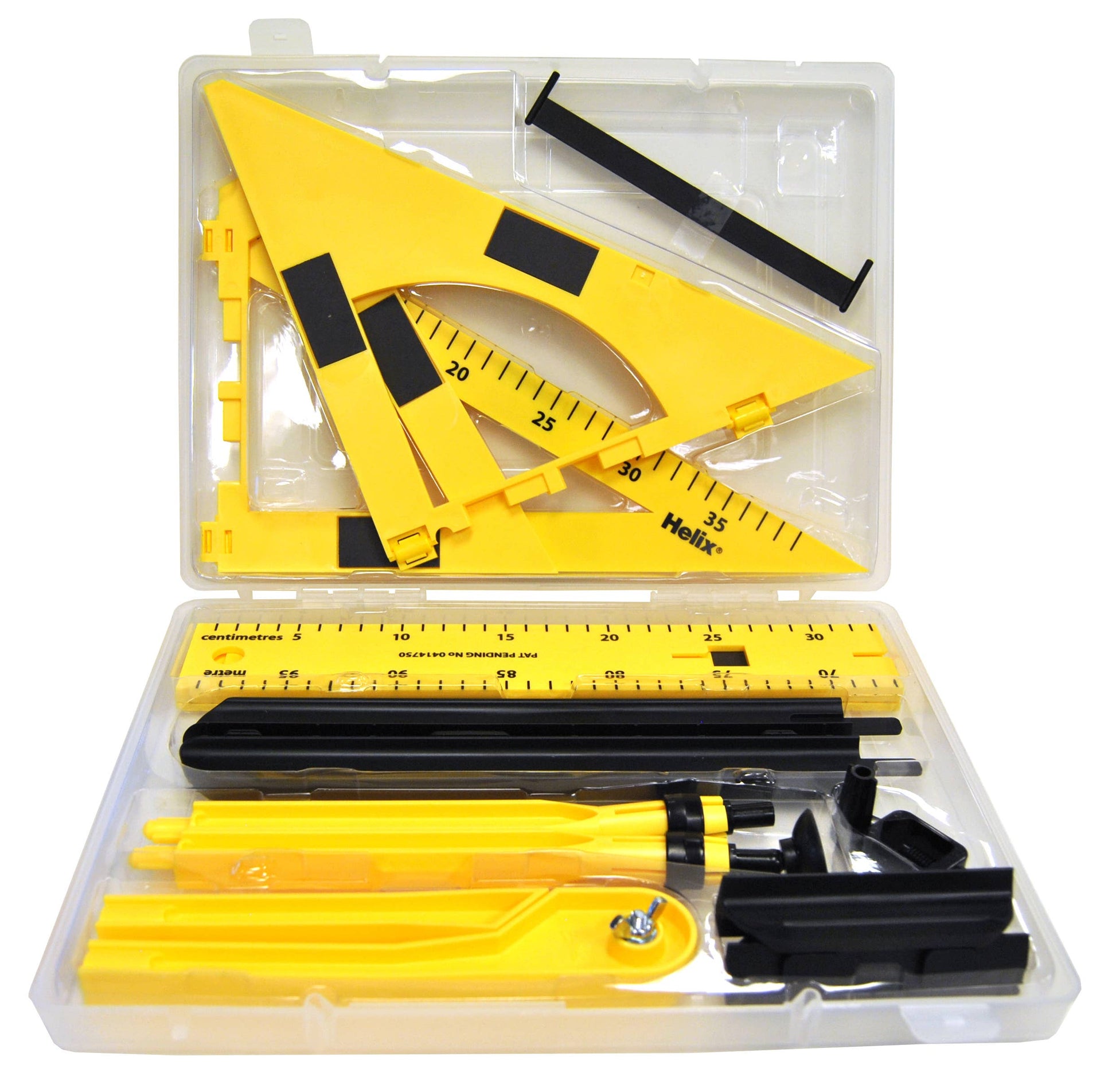 The Helix Whiteboard Accessories Kit is perfect for teachers and classrooms because it combines 5 different tools into one handy and easy-to-store kit! Each tool folds or disassembles to easily store in the compact case, and most feature magnets on the reverse side so they are easy to manipulate and use. Great for geometry, math, or physics teachers to quickly and easily draw large shapes on a board. Kit includes a 45°/45°/90° Triangle with a built-in 180° protractor, a 30°/60°/90° Triangle, a Compass with a Universal Holder and a Ruler. The vivid yellow color and large markings are easy to read, even at the back of the class! Individual components snap together with raised handles for easy manipulation and come packed in a reusable storage case.