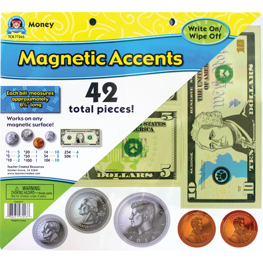 Decorate and educate with these durable, reusable magnetic accents. 42 total pieces. Each bill measures approx. 6-1/2" long.
