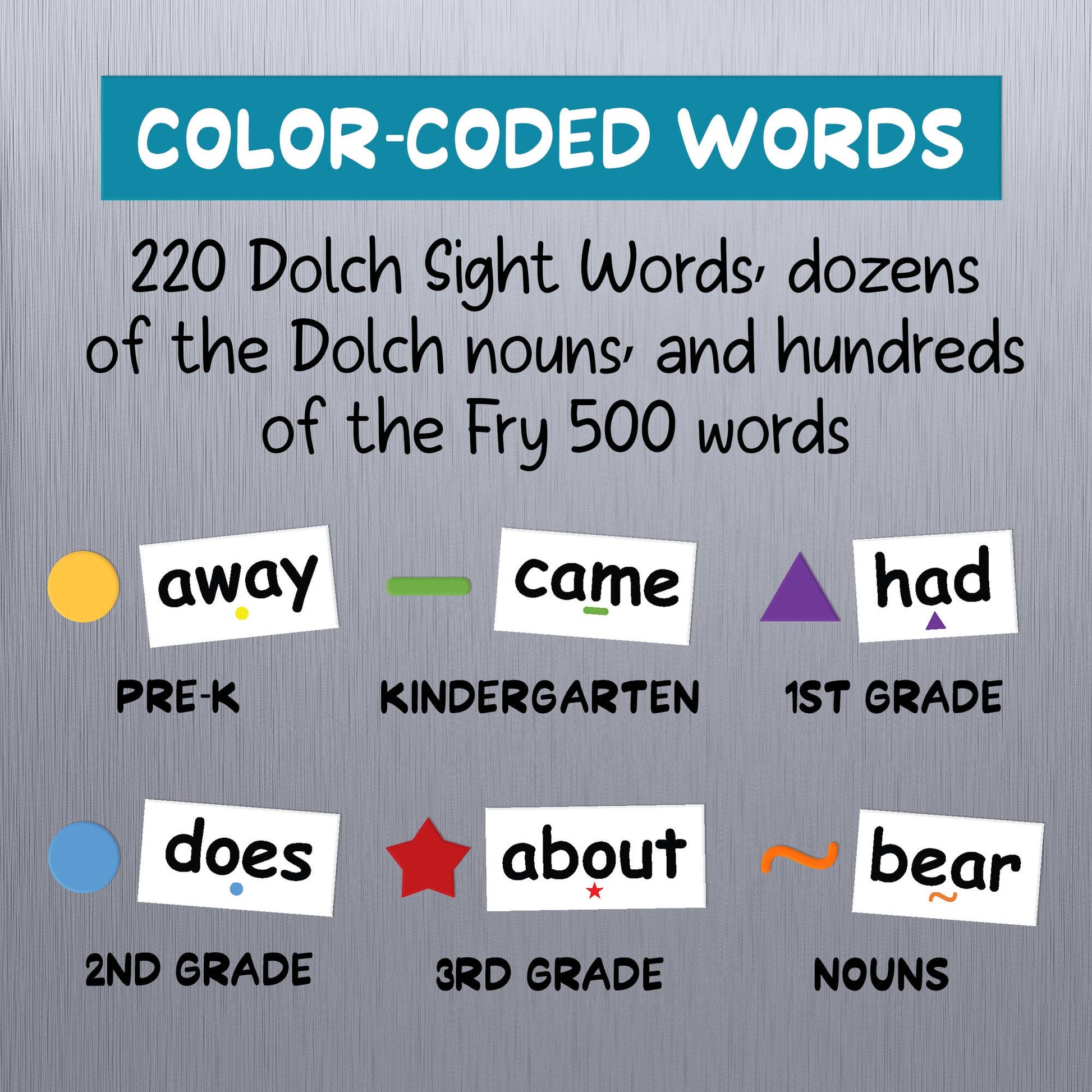 Includes all Dolch Sight Words, color-coded by grade, on big 0.75” tall pieces. Learning words and expressing imaginations just got easier for kids ages 4-8!